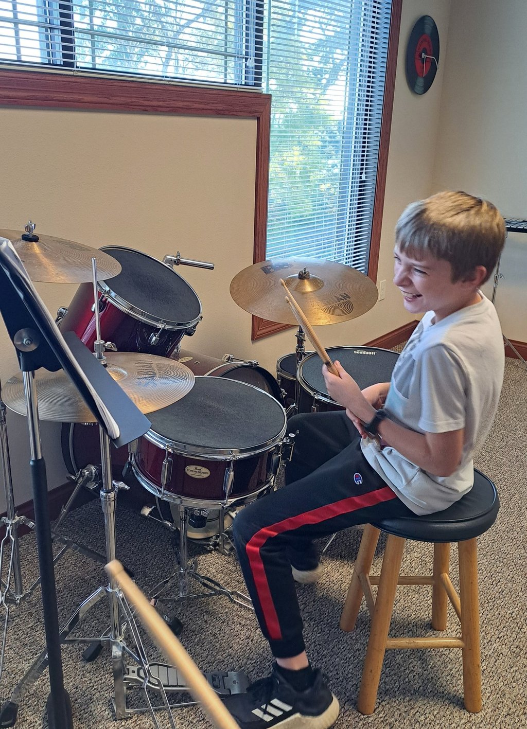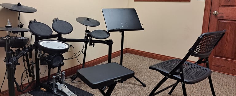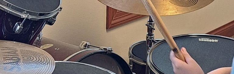 You do not have to purchase a drum kit to take lessons (though owning one at home will greatly benefit your lessons). Beginning students can learn with a drum pad and sticks for about $40. And we sell them at the studio! Choose a rubber or plastic practice pad. A plastic pad has more natural response but makes more sound.